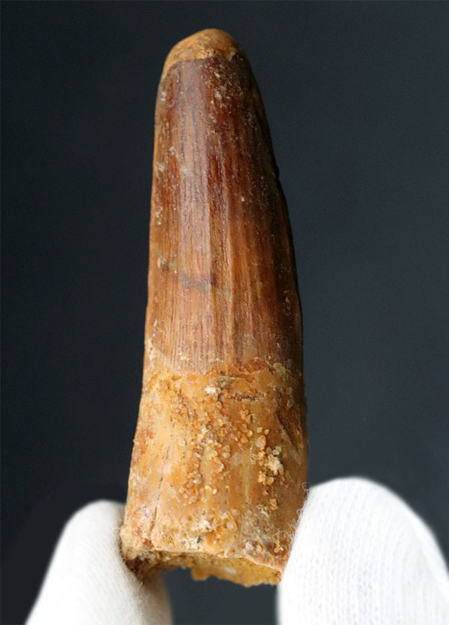 両面ともに状態は上々。特徴的な縦溝が保存されています。スピノサウルスは現世のワニと似た食性で主に魚を食べていたと言われています。歯の形や特徴を見れば、その生物の食性が分かると言います。硬い鱗を持つ白亜紀の魚を突き刺すことができるよう、円錐形をしていることが分かります。