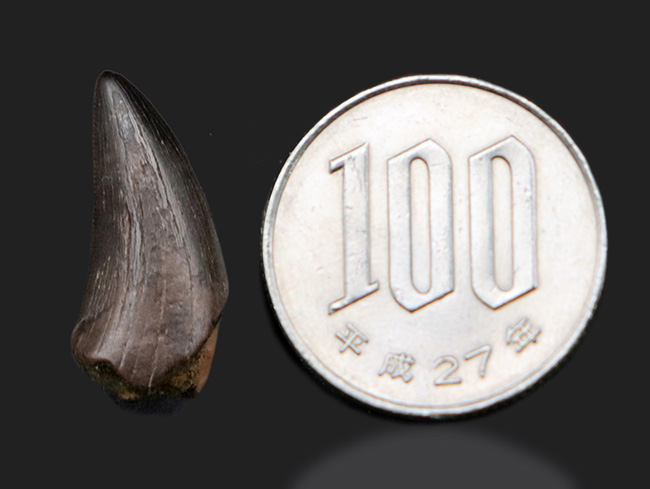 100円玉との比較。100%ナチュラルのティラノサウルス・レックスの幼体の歯化石です。