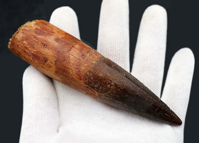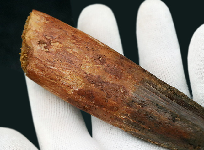 | 学名 | ロングカーブ計測117ミリ!周長90ミリ!ビッグサイズ!獣脚類恐竜、スピノサウルス(Spinosaurus)の歯化石 |
