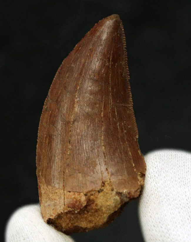 一般的に、カルカロドントサウルスの歯化石は総じて保存状態が良くありません。堆積環境によるものと思われますが、エナメル質やセレーションが保存されていないケースが多々見られます。こちらの化石はどちらもしっかりと保存されている上質品です。