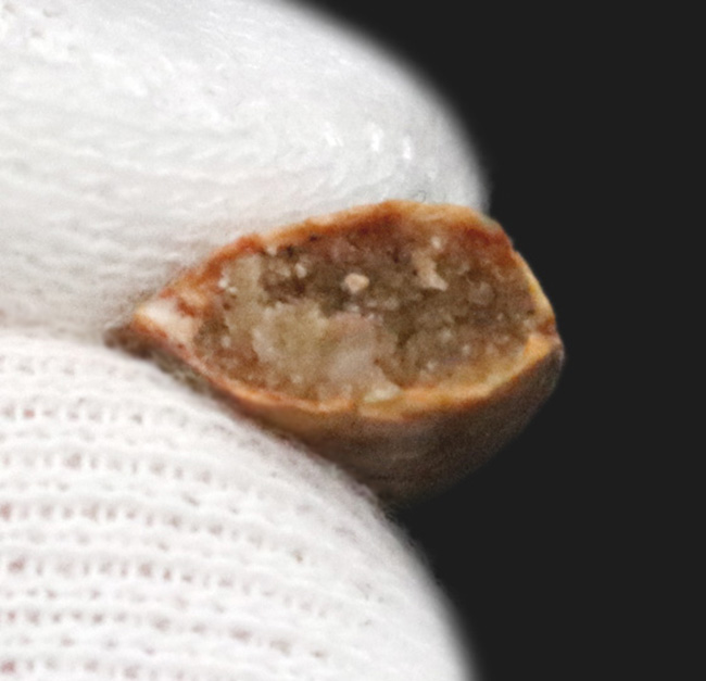 根本から撮影しました。エナメル質の厚みがよくわかりますね。底から見ると、歯の左右の縁は鋭く尖っており、エッジにはセレーション(鋸歯状のギザギザ)が残っていることが分かります。ラプトルの歯化石は比較的薄いものの、ナイフのように極端に薄いわけではなく、一定の厚みがあります。