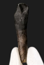 歯根とは、写真で見える下部の円筒形の部分を指します。その上にある、やや広がった黒褐色で皺模様のある部分が「歯冠(しかん)」です。歯冠は歯茎の上に露出していた部分、歯根は歯茎の下で顎と接していた部分になります。カマラサウルスに限らず、恐竜の歯化石で歯根まで残る例は非常に稀で、本品は極めて希少なコレクターズアイテムです。