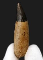 一般的な首長竜、たとえばプレシオサウルスなどと比べると、明らかに形状の違いが認められます。プレシオサウルスの歯化石はより細く、先端にかけて強い湾曲が見られますが、プリオサウルス類の歯化石は太く、明瞭な円錐形を示します。先端にかけてのカーブも控えめです。
