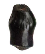 1915年になると精緻な骨格が記載され、復元図なども作られました。それによれば体長は3メートル以上、体重は200〜300kgほどと考えられています。現生のヒグマほどの大きさですが、白亜紀最末期のマーストリヒト期においては、決して大型の恐竜ではありませんでした。体の約半分は長い尾で、くちばし状の口器を持っていました。上顎前方には小さな歯が数本あり、その一部が本標本のような歯化石になります。