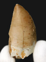 淡いベージュを呈するエナメル質の美しさと、保存状態の良いセレーションの共演をぜひご覧ください。表面には長い年月をかけて地圧によって刻まれた細かなクラックが見て取れます。1億年という途方もない時間が、この歯を芸術品へと昇華させた証でもあります。
