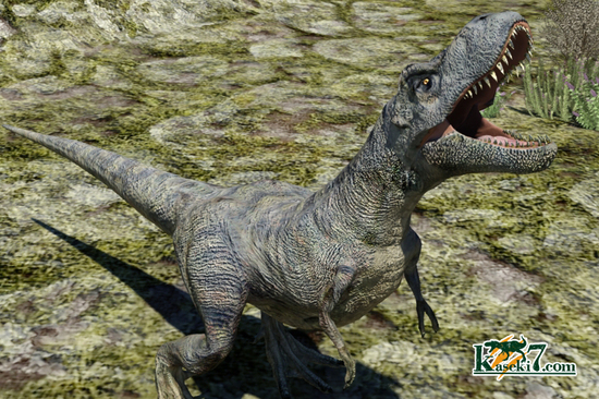 最強の恐竜といわれるティラノサウルスは、体から比べても相当に頭部骨格が大きいことが分かっています。太くて長い歯、頑丈で大きなアゴを使い、獲物の肉を食いちぎり、噛み砕くように進化したのでしょう。これは他の獣脚類であるスピノサウルス、アロサウルス、アルバートサウルス、ディロング、タルボサウルス等と比べても、言えることです。