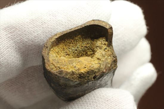 トップは磨耗されているのが確認できますでしょうか。この磨耗こそ、この歯が現実に白亜紀に使われていた証拠です。当たり前ですが、実際にこの歯がティラノサウルスのアゴに収まって使われていたということです。
