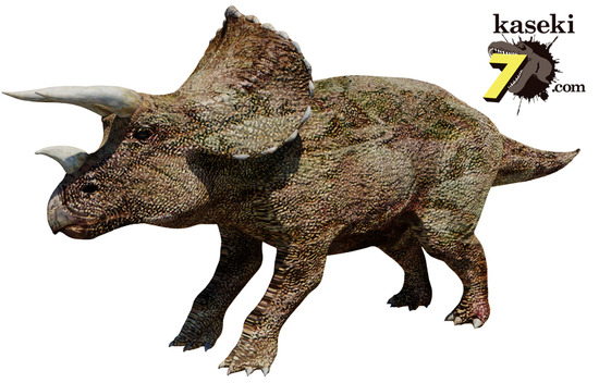 『三本の角のある顔』が名前の由来の草食恐竜トリケラトプス(Triceratops)。約6550万年前に起きた白亜紀末の大量絶滅まで、最大の角竜類の一種として繁栄していました
