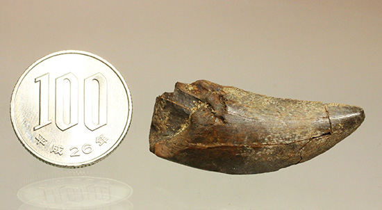ティラノサウルス・レックスの幼体の歯化石です。いくつかクラックがあり、接着補修がなされています。ただ、一部欠けたルート部分をそのままにしていることからも明らかなようにリストラクション(再構築)はありません。