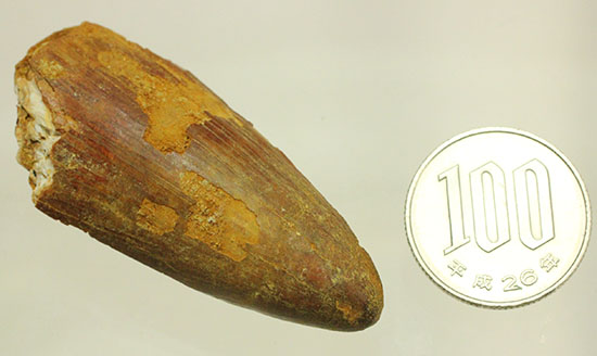 幅広、しっかりと重みの感じられる、スピノサウルスの歯化石をご紹介します。