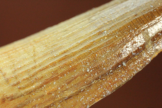 ルート部のアップです。歯の表面は茶色ですが、スピノサウルスの歯の中側は乳白色をしているのです。ルート部でその一端を見ることができます。