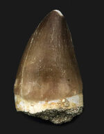 比較的多く歯の化石が出回っているが、偽造品(母岩に歯を埋め込んだものが多い)も出回っているため注意が必要です。また、出土・保存状態によって品質はさまざまです。表面がエナメル質を保ち、かつルート(根元)が太いモササウルスの歯化石は意外に数が少なく価値が高いと言われています。
