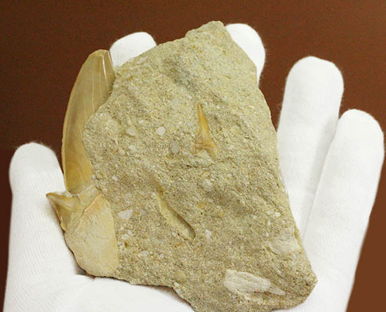 副歯が片方完全に残った、大変状態のよい大きな歯化石。もう一方は、母岩に埋もれています。