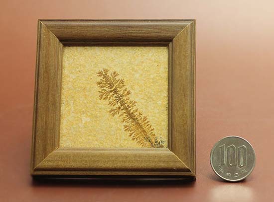 100円玉との比較。木枠付きでインテリアとして楽しめるゾルンフォーフェン産のデンドライト。