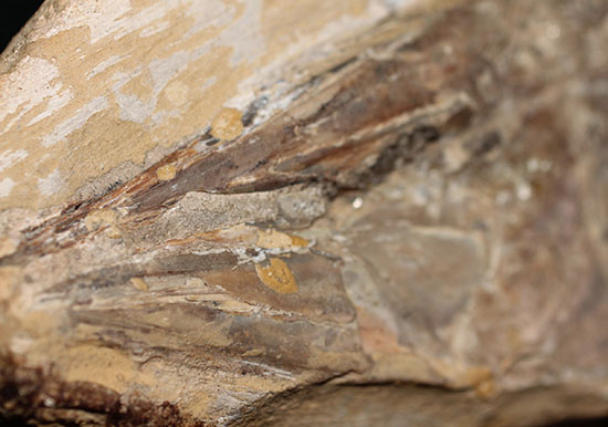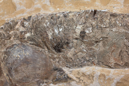 こちらエラから胴体にかけて。1億年以上前の古代魚ですが、硬い骨格を備えていました。その意味では現世の魚の主流を成す硬骨魚類(こうこつぎょるい)と変わりません。