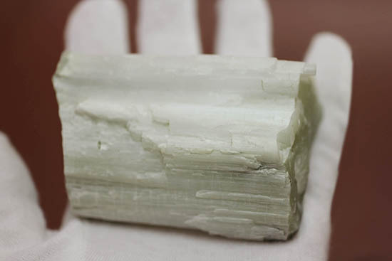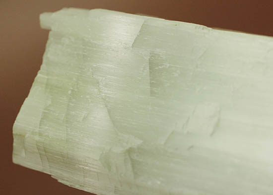 束を垂直から見ると、半透明であることが解ります。針状結晶が束になったウレックス石は、光ファイバーのように、映像を伝送する性質を持ちます。この性質をして、別名「テレビ石」と呼ばれます。この標本はかなり厚みがあるため、下の絵や文字を伝送するには透明度がなさすぎますが、薄くカットすれば、その伝送効果を体験できるはずです。しかしながら、せっかくこれほど成長しているのですから、カットすることなくコレクションしていただければ、という思いもあります。