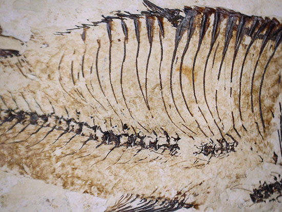 こちらにはより小さな魚の化石が残されています。背骨は保存されているものの、アバラ骨は散り散りになっています。