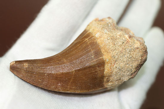 比較的多く歯の化石が出回っているが、偽造品(母岩に歯を埋め込んだものが多い)も出回っているため注意が必要です。また、出土・保存状態によって品質はさまざまです。表面がエナメル質を保ち、かつルート(根元)が太いモササウルスの歯化石は意外に数が少なく価値が高いと言われています。