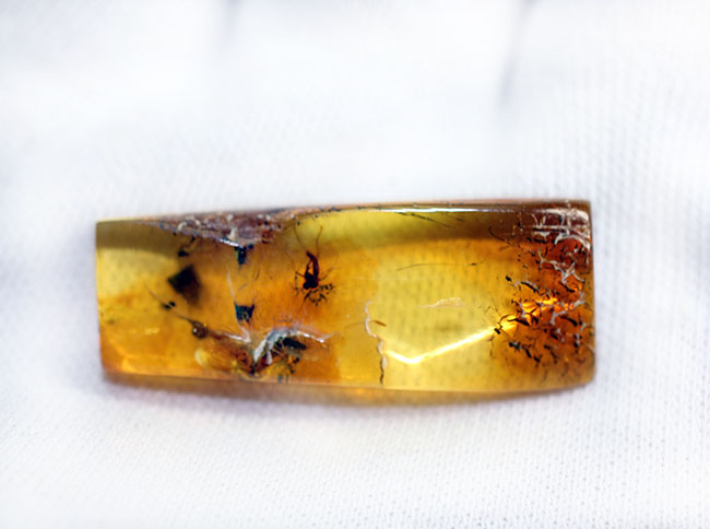 3センチの長方形の琥珀中に、肉眼で分かるほどの大きさの昆虫が包まれています。透明度が大変高いため、虫のシルエットが明確に分かります。