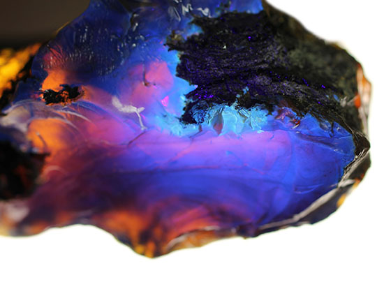 この青い物体が琥珀だと言ったら驚くでしょうか。こちらは、メキシコ産の希少なブルーアンバーです。しかも、写真の通り、広範囲に渡って青に輝きます。しかし、いつも青に輝くわけではありません。