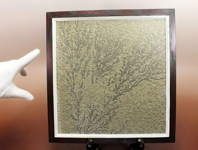 写真左下から上方に広がったと思われるデンドライト。デンドライトは一見シダ類などの植物の化石に見えるかもしれませんが、実際には鉱物です。マンガン等が、一定方向に樹枝状に結晶成長したことで、このような美しい模様を作り出しました。本標本のように額縁をつければ、自然が生み出したアート作品になります。