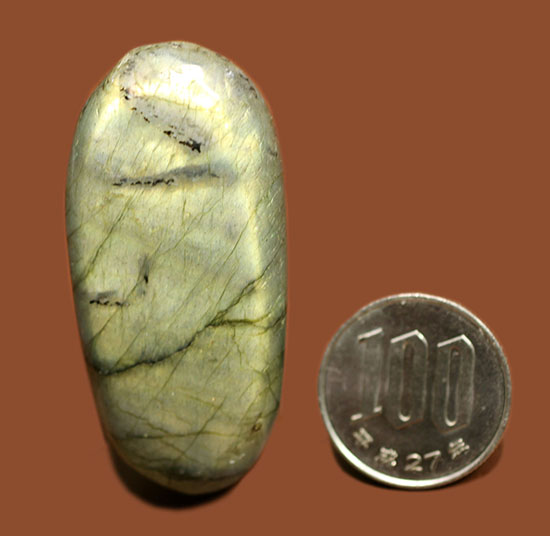 真っ黄色でもなく、黄緑でもない、ペールイエローです。こうした閃光効果は、ラブラドライトに限って「ラブラドレッセンス」といわれています。