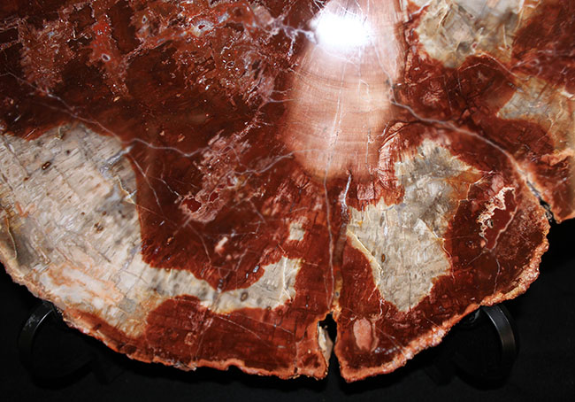 ご覧の通り、全体にわたってシリカ化が進み、各所、半貴石のような状態まで進行しています。樹木の断面が宝石化したといっても言い過ぎではないでしょう。赤い部分は赤鉄鉱が含まれ、ジャスパーとなっています。白い部分についても、粘土鉱物が含まれたジャスパーでやや黄色がかっています。