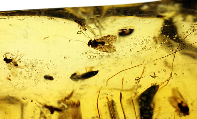 琥珀は、樹の樹脂が固まって化石化したものです。しばしば、琥珀の中から、昆虫や植物が見つかるのは、樹脂が土の上に流れ落ちる際に、虫やその他の生き物たちが一緒に取り込まれてそのまま化石となるからです。琥珀の中に内包された虫たちは、非常によい状態で保存されるので、触覚や羽などが生きた当時のまま見ることができるものもあります。昆虫や植物が入った琥珀は、まさにその時代の環境が内包されたタイムカプセルのようなもので、「虫入り琥珀」と呼ばれています。虫入り琥珀は世界中のコレクターからも人気が高く、かなりの高値で取引されます。