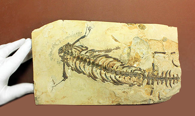 こちらは、化石コレクター羨望のアイテムの一つ、メソサウルスの化石です。頭部の一部、胸部、脊椎、四肢、尾の一部が残された良質品です。個人で手に入れる化石コレクションとしては最もレアなアイテムの一つ。