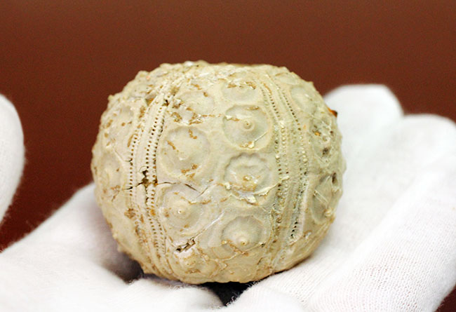 こちらはモロッコ産の白亜紀のウニの化石です。ウニは古代から現世まで種を変えながらながく生息している生物です。