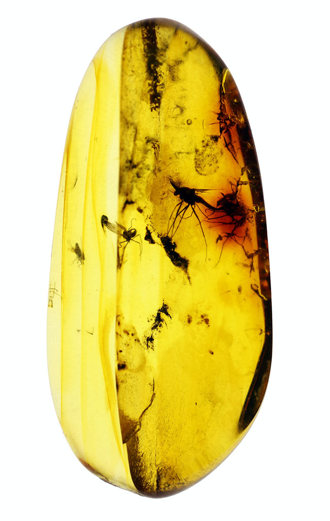 バルト海産の琥珀はおよそ4000万年前以上の針葉樹の樹脂が化石になったものです。現在のバルト海は当時、広大な森林地帯であったと考えられています。そこに棲息していた虫が琥珀の中に取り込まれることがあり、このようにあまり傷むことなく現在までたどり着きました。