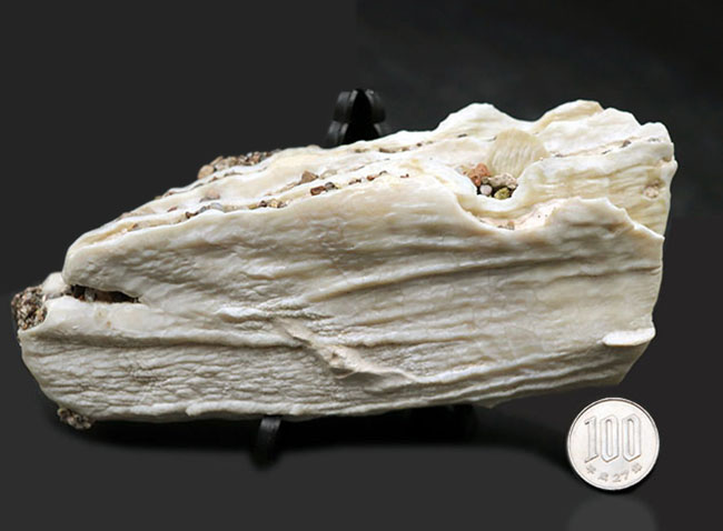 100円玉との比較。非常に珍しいコロンビアマンモスの状態の良い臼歯の化石です。