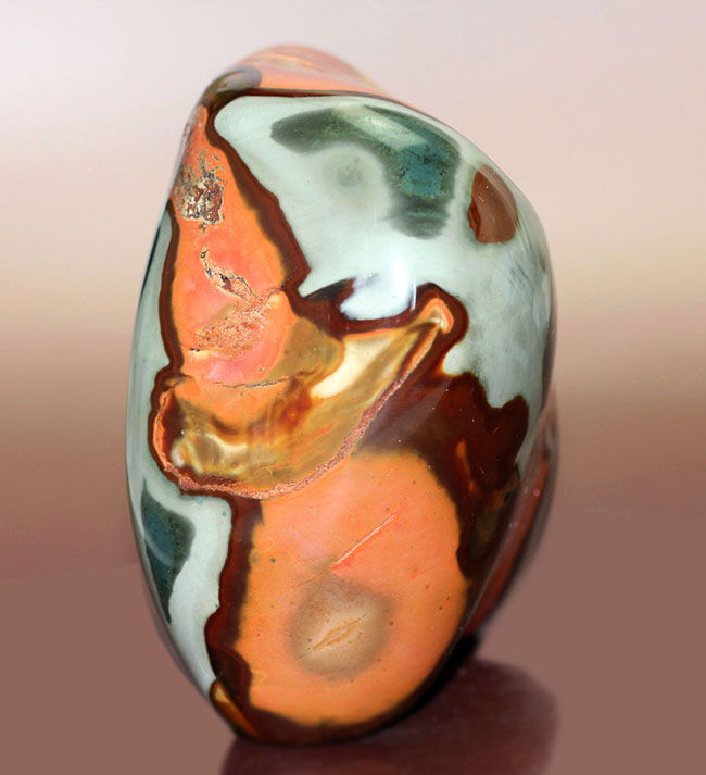 なんと1.4kg超えの巨大な標本です。ジャスパーといえば一般には赤色を呈する場合が多いのですが、こちらは、緑やクリーム色など多種多様な色を含んでいます。それぞれが境界を張ってアイランドを形成しているのが面白い。