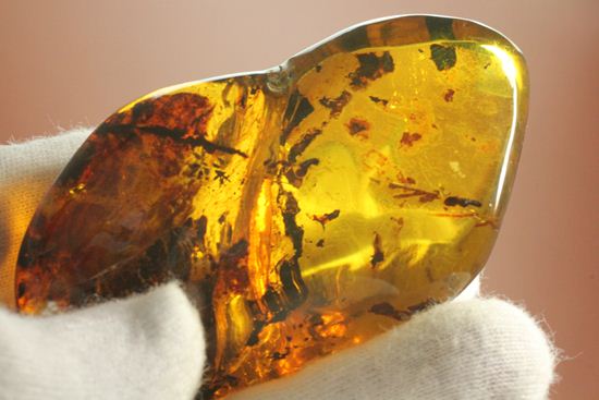 本標本は、虫入りでないのですが、植物片とおもわれる内包物たっぷりの標本です。