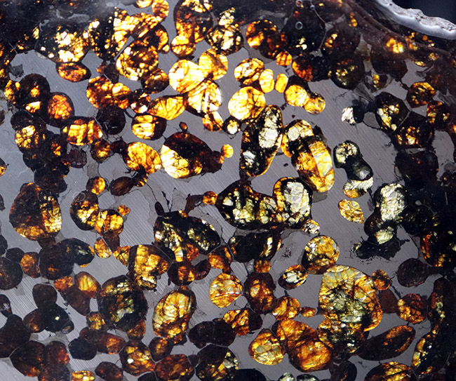 上の写真と比較してください。こちらは後方からライトを当てた一枚。かんらん石が爛々と輝いているのがお分かりでしょう。黄色から薄オリーブグリーンに輝くのは、極めて保存状態の良い証拠です。