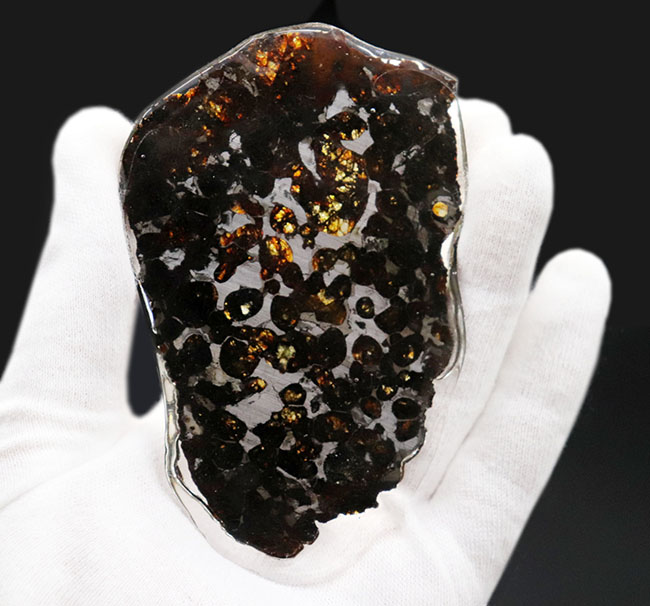 | 学名 | 透明度の高いかんらん石が作り出す黄金の輝き!ケニヤ・セリコ産、2016年に発見された新しいパラサイト隕石(本体防錆処理済み) |