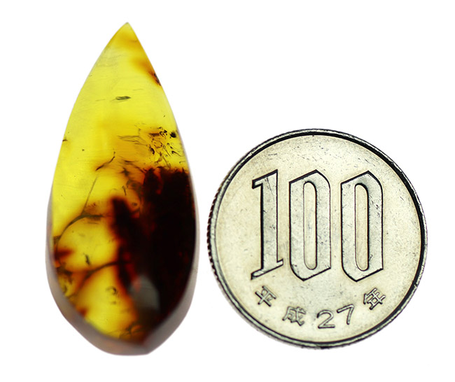 100円玉との比較。ドロップ型の美しい琥珀です。