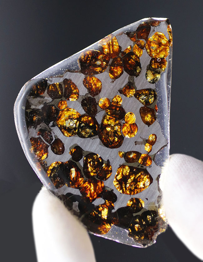 それがどうでしょう、光を当てると、キラキラと輝き始めます。パラサイト隕石は地球上で見つかる隕石のなかで、最も希少とされる石鉄隕石の一種です。世界で最も美しい隕石と評される、この美しさをご堪能ください。