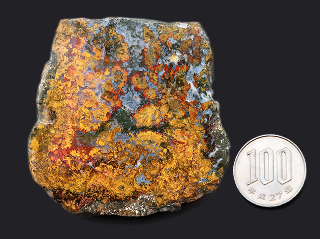 100円玉との比較。美しい橙を呈する、ハンガリー産の特殊なメノウです。丸模様はストロマトライトと考えられています。