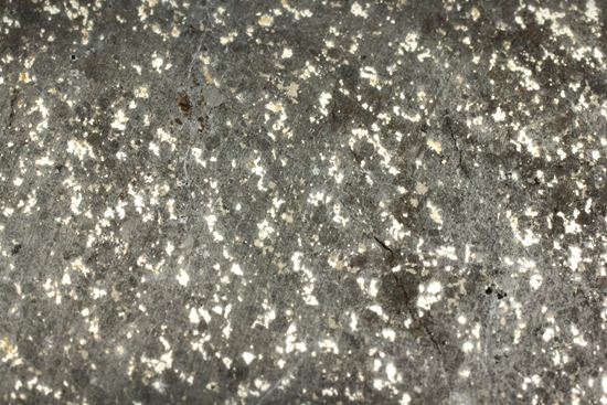 黒味がかった切断面に、数多くの金属の細片や筋が広がっています。