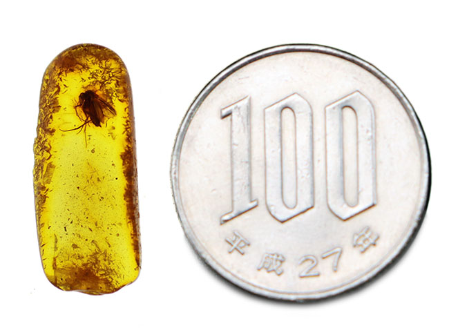 100円玉との比較。キノコバエ科の虫を内包したバルティックアンバーのご紹介でした。