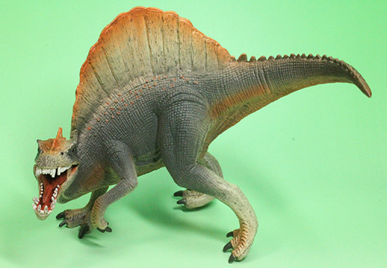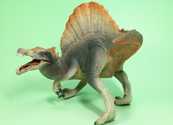 最大サイズの肉食恐竜として名高い、北アフリカ大陸の巨大恐竜、スピノサウルスフィギュアです。アゴが開いたり閉じたりする可動式です。