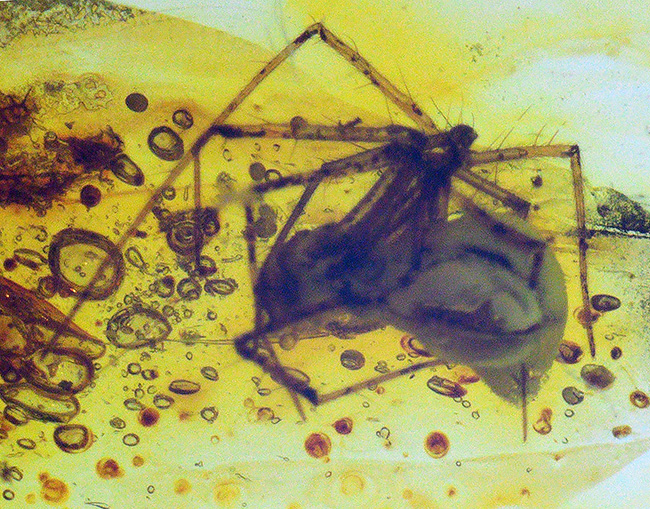 長い脚を折りたたむように化石化したクモが一匹、古代の泡とともに包まれています。