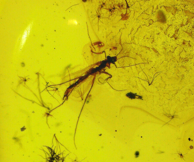 内部には、足の長い虫が内包されています。またその左側に”毛”のような物体が散見されます。これは星状毛(せいじょうもう)と言われる、広葉樹の雄花の化石です。星状毛はバルト海産の琥珀に観察される特徴的な内包物です(他産地の琥珀では見られません)。