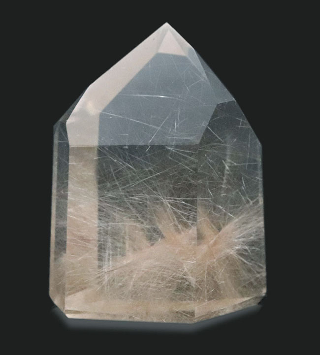 こちらはルチルクォーツの名で知られるブラジル産の水晶です。内部に見える髪の毛のような細い物体がルチルです。ルチルとは二酸化チタンのことで、金色に近い色を呈することで知られています。