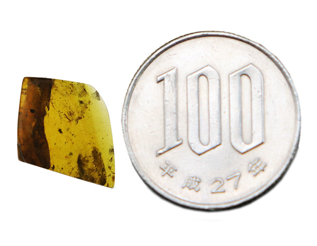 こちらはミャンマー産の非常に古い琥珀、バーマイトです。かつての国名であるビルマにちなんでビルマイトまたはバーマイトと呼ばれています。中には、古代の昆虫が保存されています。これらの昆虫は古生代デボン紀に初めて現れて以来、その姿をほとんど変えることなく現在に至るまで生命をつないでいます。