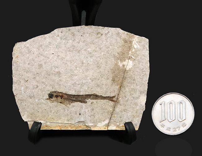 100円玉との比較。こちらは中国遼寧省の白亜紀前期の地層から発見された古代の絶滅断水魚、リコプテラの化石です。