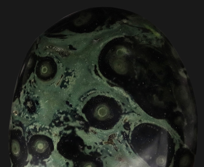 こちらはマダガスカル産の緑色と黒色の渦巻き模様で知られるカンババ・ジャスパーです。カンババ(Kambaba)とは、マダガスカル語の「Mamba」に由来し、「ワニ」を意味します。石の模様はワニの皮に似ているため、この名がつけられました。別名、クロコダイル・ジャスパーと言います。
