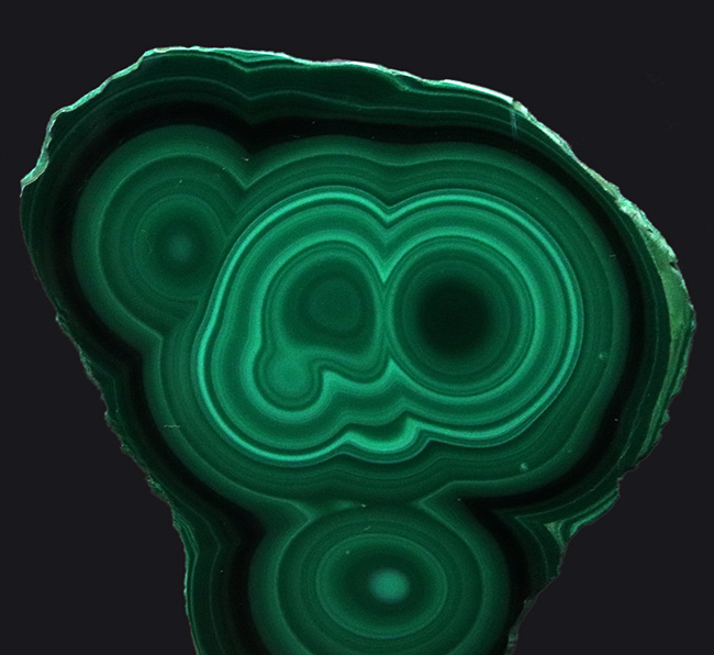 こちらは、コンゴ民主共和国産のマラカイトです。マラカイトは和名では孔雀石と言います。文字通り、孔雀の羽に見られるような丸い模様が特徴的で、鉱物コレクターに高い人気を博しています。私はこの模様を見て、孔雀ではなく、うっかりお猿さんの顔を思い浮かべてしまいましたが、皆さんはいかがでしょうか?マラカイト(孔雀石)は銅を含む鉱物で、昔は銅を取り出すために使われていました。しかし、現在では銅を直接採掘する方が安あがりのため、マラカイトから銅を取り出すことはほとんどなくなっています。ちなみに、コンゴには「コンゴ共和国」と「コンゴ民主共和国」があり、名前は似ていますが別々の国です。本標本の産地であるコンゴ民主共和国は鉱物資源が豊富で、マラカイトのほか、銅、コバルト、ダイヤモンドなどが多く採掘されています。