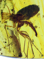 これは、琥珀の原料となる樹液に絡め取られたとしても、脱出できるほど大きな虫は化石として残りにくい、という単純な理由によります。そのため、このように肉眼でもはっきりと判別できるほどの虫が内包されている例は、きわめて稀です。